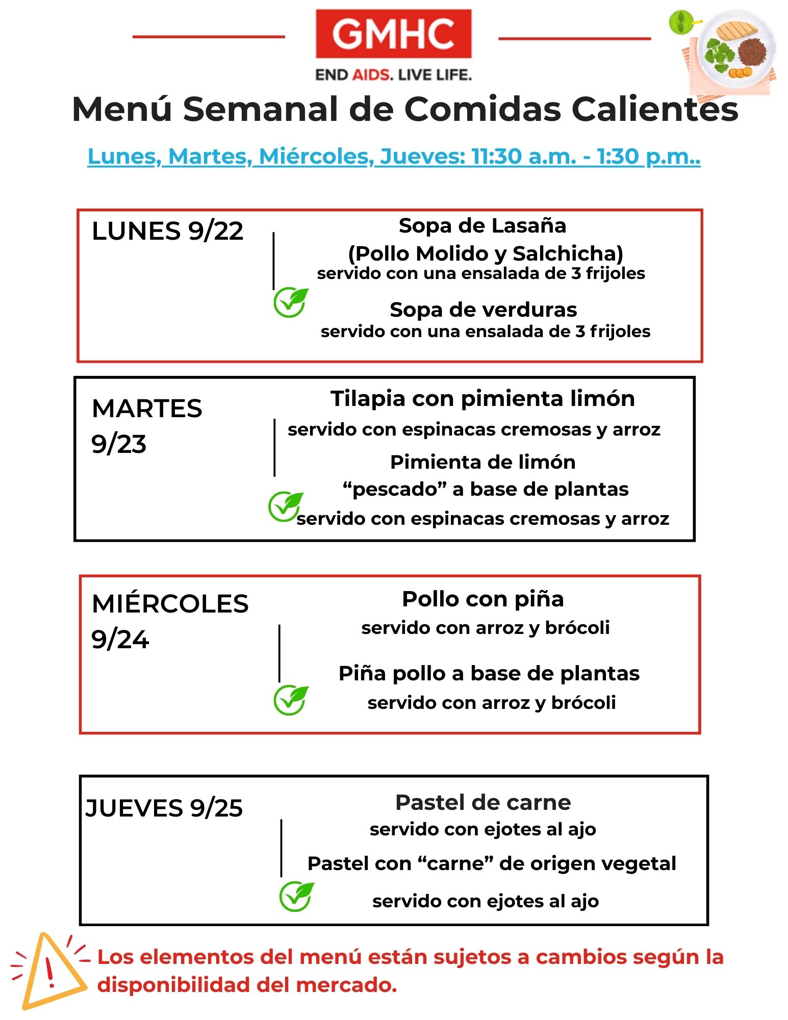 We are currently serving lunch to GMHC clients on Monday — Thursday, 11:30 a.m.–1:30 p.m. Please note the following: